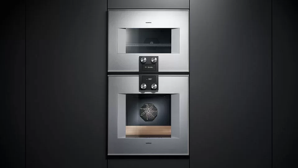 Духовой шкаф Gaggenau работает в 13 режимах нагрева. Камера легко очищается с помощью пиролиза и каталитического фильтра для воздуха. В комплекте: эмалированный противень, стеклянная сковорода, термощуп с функцией отключения, решетка для гриля, четырехуровневые направляющие.