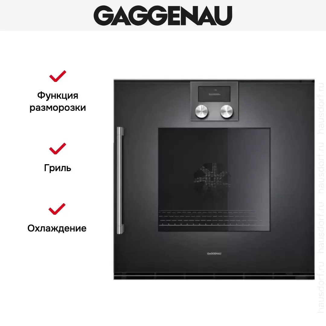 Количество режимов работы в духовом шкафу Гаггенау: 13. В число доступных программ входят: классический нагрев, верхний нагрев, нижний нагрев, конвекция, брожение, гриль для создания хрустящей корочки, пицца, и другие. Помимо основных программ воспользуйтесь специальными возможностями этого прибора: размораживанием продуктов, чтобы сократить время на подготовку; опцией автоматического поднятия теста; быстрым разогревом для ускорения работы; поддержанием температуры в камере на определенном уровне, чтобы блюда не остывали; и другими. Тип гриля в этой модели — электрический.