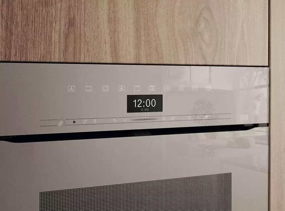 Особенности дизайна и внешней панели управления — также важный пункт при выборе духовки на кухню. В данной модели нужно обратить внимание на цвет — жемчужный, охлаждение двери, чтобы поверхность и мебель вокруг не нагревались.