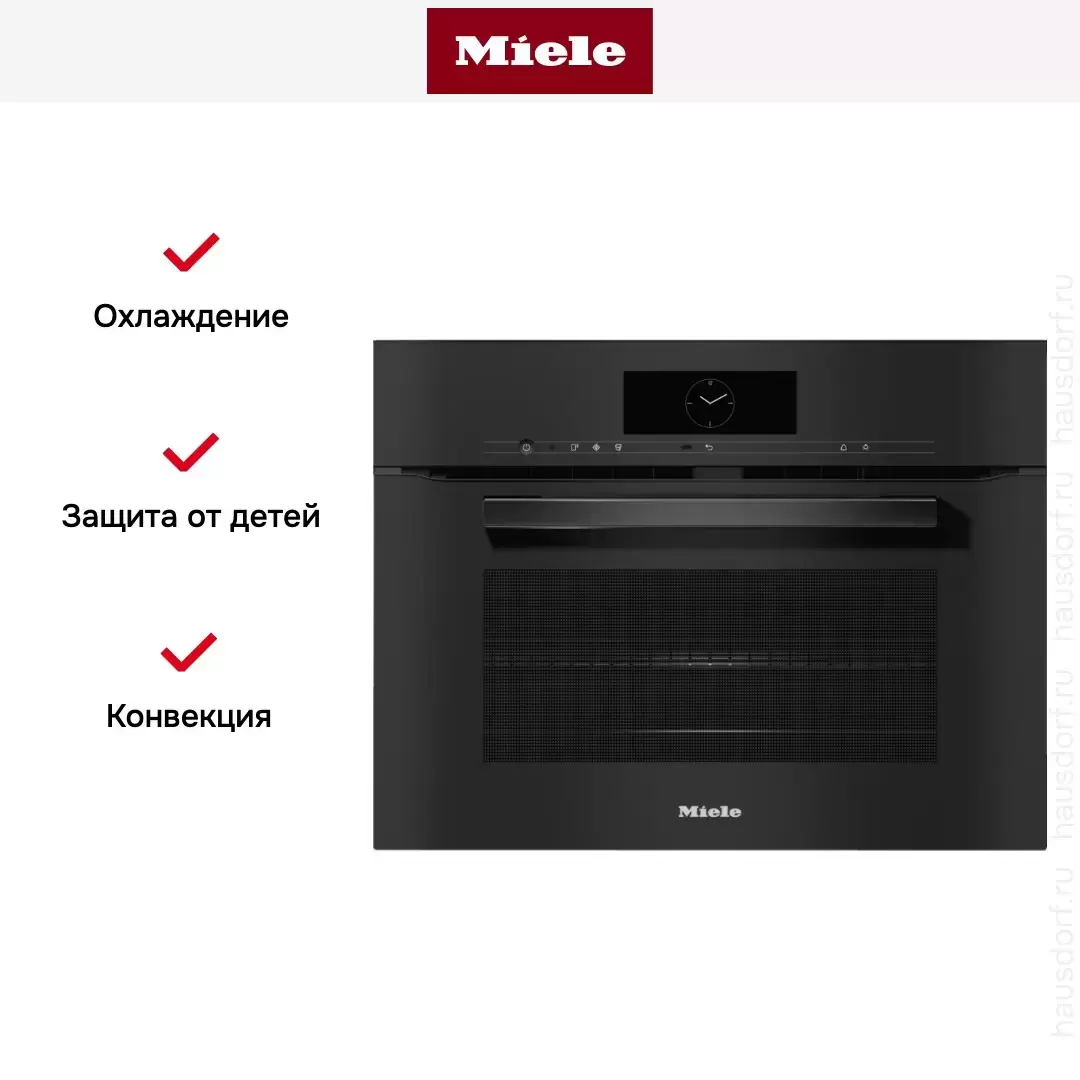 Компактное устройство высотой 45 см и объемом 38 литров позволяет готовить одновременно на 3 уровнях. Корпус из нержавеющей стали защищен от отпечатков пальцев покрытием CleanSteel, его достаточно просто протереть без применения чистящих средств. Для задания температуры, режима работы и дополнительных опций служит сенсорный дисплей M Touch. Камера из нержавеющей стали с рельефной поверхностью PerfectClean отличается прочностью, на ней не образуется царапин. Модель оснащена функцией СВЧ, комбинированными режимами с грилем и конвекцией, автоматикой жарения, режимом размораживания.
