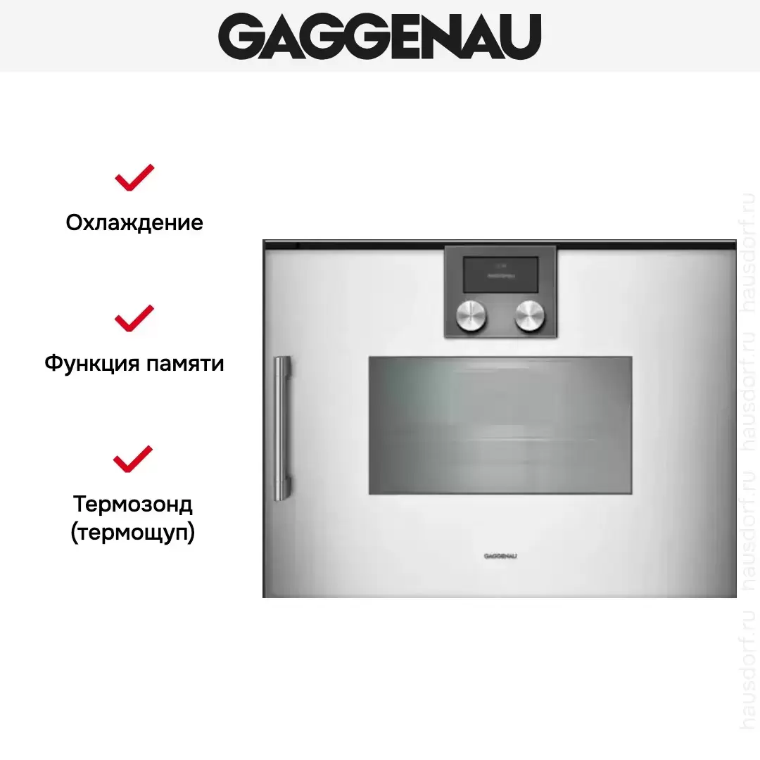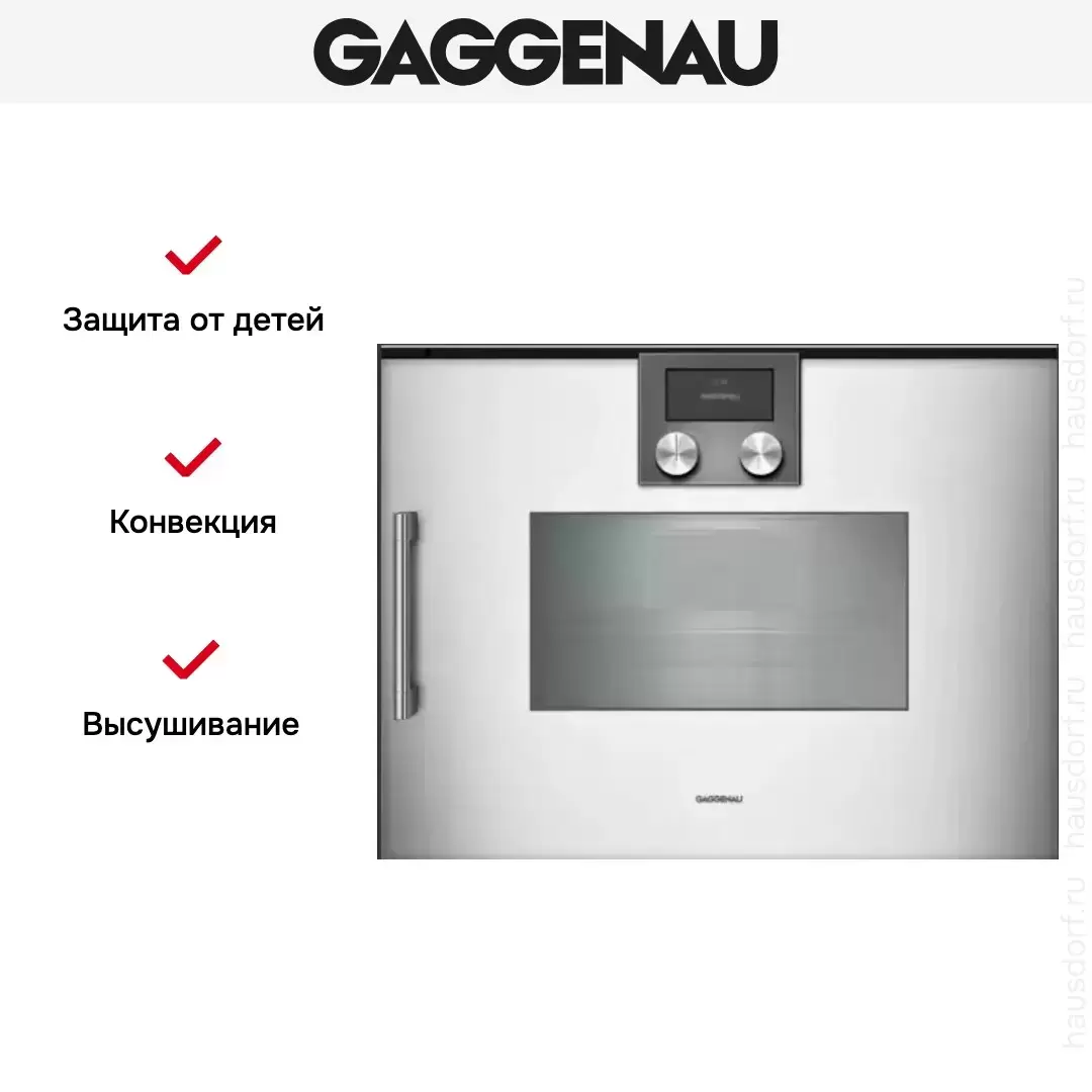 Духовой шкаф — пароварка Gaggenau BSP 250-131 выполнен в серебристом цвете. Дверь модели полностью стеклянная и не обладает возможность перевешивания. Дверной упор находится с правой стороны. Сенсорный TFT — дисплей расположен в верхней части прибора. Управление осуществляется с помощью поворотных переключателей. В комплекте находятся 2 съемных контейнера для чистой и использованной воды. Функция памяти запоминает все выбранные вами индивидуальные рецепты (включая те, которые были использованы с термощупом). Во время работы корпус устройства остается холодным. Среди дополнительных преимуществ: