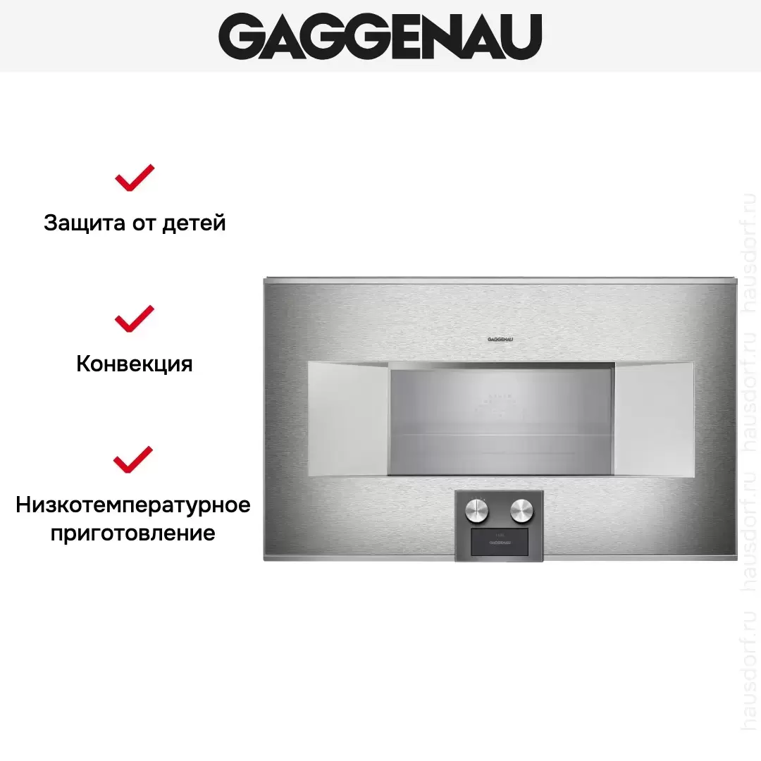 Gaggenau BS485112 — комбинированный духовой шкаф-пароконвектомат с большой рабочей камерой из нержавеющей стали, которая освещается двумя LED-лампами. Управление происходит с помощью поворотных переключателей и сенсорного TFT-дисплея. За безопасность эксплуатации отвечают функции блокировки от детей и защиты на время отпуска.