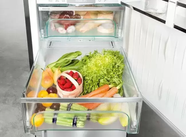 Полноразмерный агрегат высотой 201 см и шириной 70 см в корпусе цвета Black Steel с обработкой от отпечатков пальцев SmartSteel рассчитан на загрузку большого количества продуктов. Снаружи на дверце находится 7-дюймовый сенсорный цветной TFT-дисплей для регулировки температуры и сенсорные кнопки для задания дополнительных опций. Управлять работой устройства можно также дистанционно: для этого требуется установить дополнительный модуль SmartDeviceBox. Прибор оснащен двумя контурами охлаждения DuoCooling для независимой регулировки температуры в камерах и раздельного воздухообмена. Автоматическое размораживание в холодильном отделении и система NoFrost предотвращают оседание инея на внутренней поверхности камеры. В холодильном отделении продукты размещаются на полках из закаленного стекла, в ящиках для овощей и фруктов и на полках Premium GlassLine на дверце. В зоне свежести предусмотрены отделение Dry Safe с низкой влажностью и отделение HydroSafe с повышенной влажностью для свежей зелени и овощей. Морозильная камера с контейнерами FrostSafe с прозрачной передней частью может работать автономно при отключении электроэнергии до 24 часов.