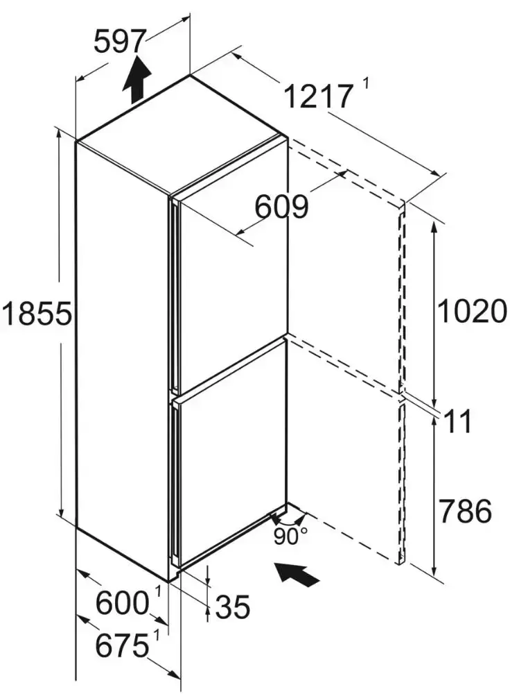 Общий объем составляет 339 литров. Перенавешиваемая дверца со встроенной ручкой оснащена доводчиком и закрывается мягко. В морозильном отделении предусмотрена система размораживания No Frost, холодильное отделение размораживается автоматически. Холодильник с вентиляцией через лицевую панель и сухой задней стенкой может быть расположен вплотную к стене или установлен в нише. Для приготовления кубиков льда служит полуавтоматический ледогенератор EasyTwist-Ice.