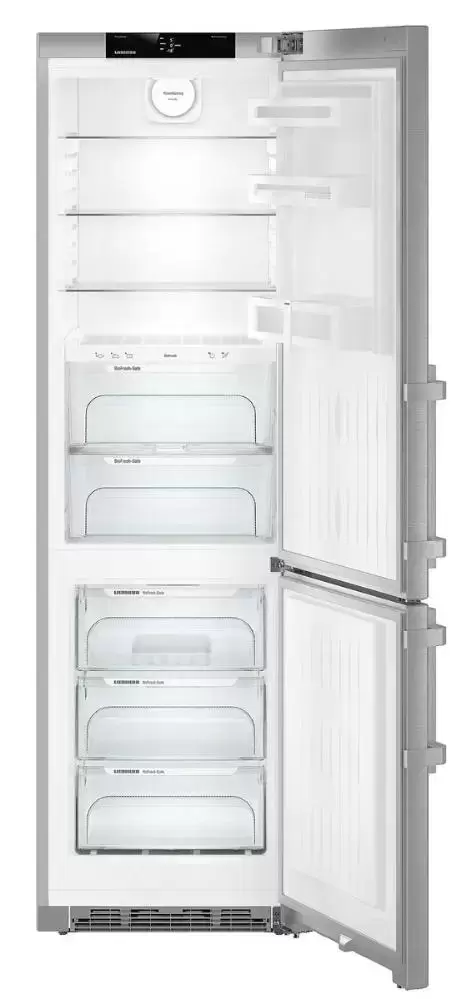 Liebherr CBNef 4835 — отдельностоящий двухкамерный холодильник. Модель немецкой сборки достигает в высоту 201 см, но благодаря стандартной ширине 60 см может быть установлена в кухне небольшой площади. Новая компоновка BluPerformance позволила увеличить объем до 391 литра за счет отсутствия на задней стенке конденсатора и резервуара для сбора талой воды. Серебристый фронт изготовлен из нержавеющей стали с покрытием SmartSteel, предохраняющим от загрязнений и мелких повреждений. Алюминиевая ручка оснащена встроенным механизмом открывания. Дверцу благодаря особенностям конструкции можно перенавесить справа налево. В верхней части за дверцей расположена панель управления, содержащая сенсорные кнопки и 2,4-дюймовый сенсорный монохромный TFT-дисплей. При необходимости устройством можно управлять с мобильного телефона или планшета: предварительно необходимо установить специальный модуль SmartDeviceBox. Система NoFrost позволяет замораживать продукты с помощью потока холодного воздуха, который создается вентилятором. При этом на внутренней поверхности камеры не появляется наледь, а размораживание значительно упрощается. Класс энергопотребления А++ гарантирует экономичную работу устройства.