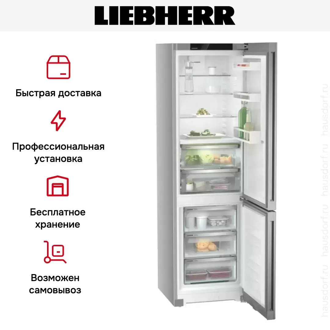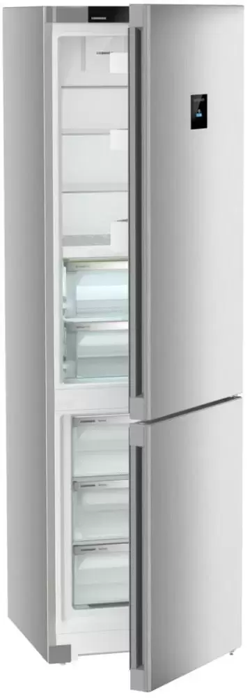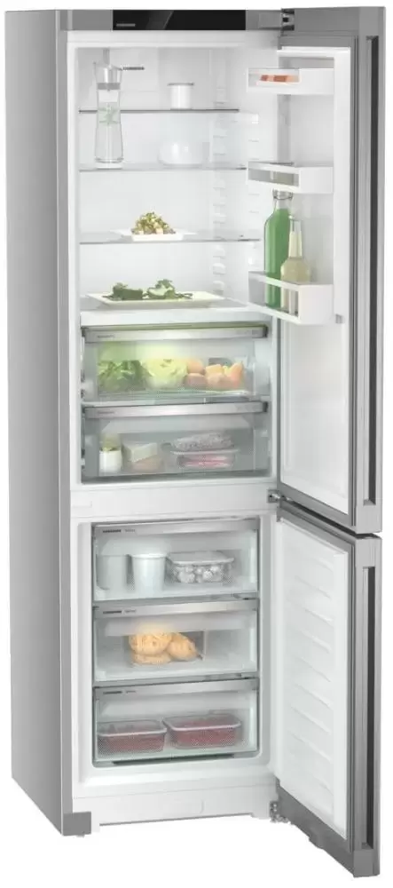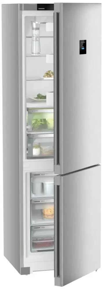 Liebherr CBNsfd 5733 — отдельно стоящий холодильник высотой 2 метра в серебристом корпусе. Нижняя морозильная камера оснащена системой NoFrost, предотвращающей обледенение стенок. Зона свежести состоит из двух контейнеров на телескопических шинах: Fruit & Vegetable-Safe для хранения овощей и фруктов и Dry Safe с пониженной влажностью для мяса и рыбы.