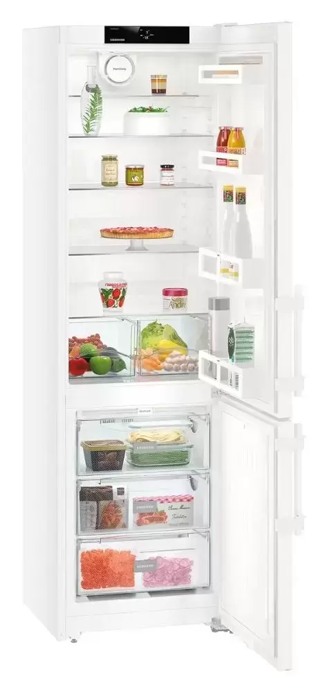 Liebherr CN 4005 — двухкамерный холодильник объемом 356 л. Имеет простое сенсорное управление, на монохромном TFT-дисплее отображаются индикаторы температур в холодильной и морозильной камерах. О неисправности или неплотно закрытой двери уведомит оптическая и акустическая сигнализации.
