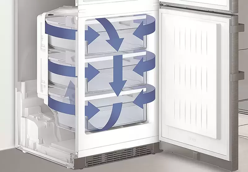 Модель из серии BluPerformance оснащена системой охлаждения, занимающей минимум места и увеличивающей вместимость. Эта система раздельного охлаждения DuoCooling позволяет настраивать температуру в обеих камерах без смешения воздушных потоков и запахов. Зона свежести BioCool с регулировкой влажности увеличивает срок хранения овощей и фруктов. Контейнер удобно выдвигается на телескопических направляющих.