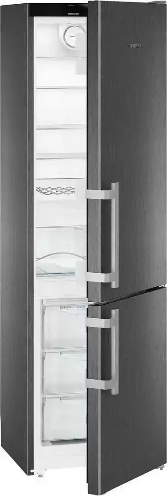 Двухкамерный отдельно стоящий холодильник Liebherr CNbs 4015 Comfort NoFrost — вместительная модель высотой 201 см и общим объемом 390 литров. Его отличает стильный корпус из стали цвета «черный металл» с обработкой против отпечатков пальцев. Морозильная камера оснащена системой размораживания No Frost. Электронная панель управления с большим сенсорным TFT-дисплеем расположена за дверцей. Устройство относится к высокому классу энергоэффективности A++.