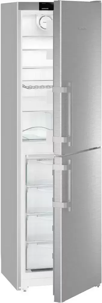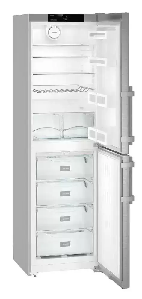 Холодильник Liebherr CNef 3915 Comfort NoFrost — отдельно стоящее устройство в корпусе серебристого цвета, которое можно устанавливать вплотную к стене. Материалом для дверцы служит нержавеющая сталь с обработкой от отпечатков пальцев SmartSteel. Дверной упор расположен справа, при желании его можно перенавесить. Общий полезный объем составляет 340 литров, из них 119 литров приходится на четырехзвездочную морозильную камеру. Электронная панель управления с 2,4-дюймовым сенсорным монохромным TFT-дисплеем и индикаторами температуры холодильной и морозильной камер располагается за дверью, имеется возможность блокировки от детей. Устройством можно управлять удаленно при помощи модуля SmartDevice-Box, который устанавливается дополнительно. В холодильной камере продукты размещаются на полках Comfort GlassLine из закаленного стекла. В морозильной камере имеются плотно закрывающиеся контейнеры FrostSafe. Автономное сохранение холода при отключении электроэнергии возможно на протяжении 18 часов.