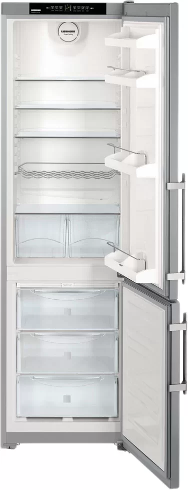 Холодильник Liebherr CNPesf 4003 Comfort NoFrost представлен в цвете нержавеющая сталь. Корпус легко очищается от разводов и отпечатков пальцев. Ручки со встроенными толкателями обеспечивают комфортное открытие дверцы. Внутри представлено два ящика для организации раздельного хранения. Прозрачный пластик обеспечивает хороший обзор содержимого. Стеклянные полочки отличаются высокой прочностью и выдерживают большие нагрузки. Их так же можно регулировать по высоте — для этого предусмотрены направляющие по всей высоте камеры. Светодиодная подсветка создает идеальный обзор содержимого. Холодильник Либхер CNPesf 4003 располагает индикациями, которые оповещают как об открытой двери в течении длительного времени, так и повышения температуры. Цифровой термометр повышает комфорт при эксплуатации прибора.