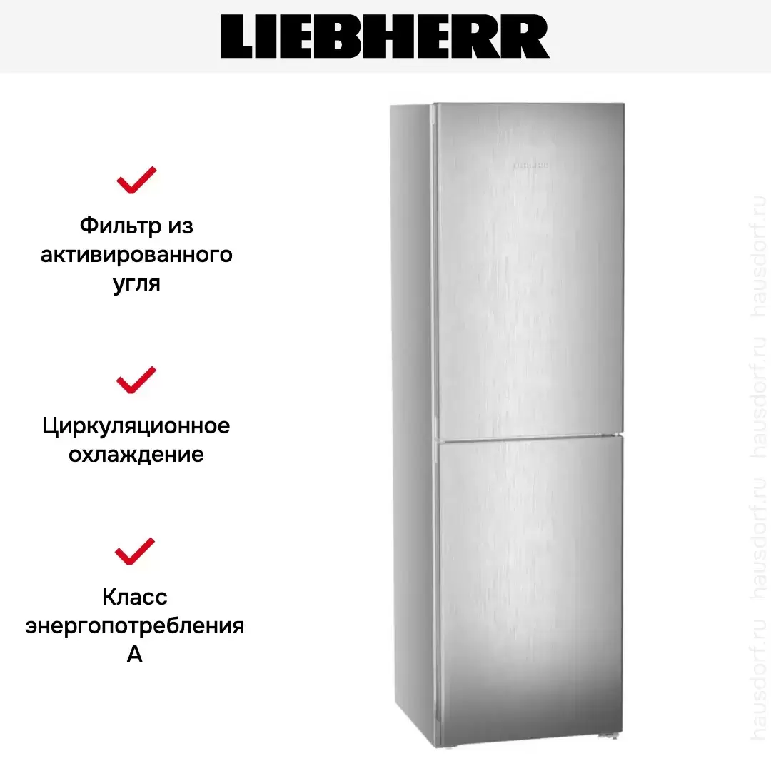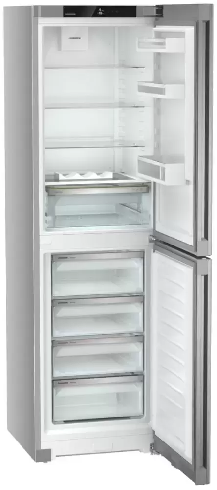 Liebherr CNsff 5704 Pure NoFrost — отдельно стоящий холодильник в корпусе серебристого цвета, со стальным фронтом. Морозильная камера расположена снизу, общий объем составляет 370 литров. Дверца с доводчиком закрывается неслышно. Система DuoCooling с двумя независимыми контурами охлаждения позволяет точно регулировать температуру в каждой камере.