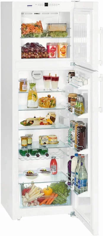 Холодильник Liebherr CTN 3663 Premium NoFrost — отдельно стоящая модель белого цвета высотой 191 см с эффектным глянцевым фасадом. Общий полезный объем его составляет 306 литров. В верхней части корпуса за дверцей находится панель управления с дисплеем MagicEye со светодиодной индикацией температуры и кнопками SoftTouch. С системой размораживания NoFrost исключается намерзание льда на стенки и не требуется длительное оттаивание. О появлении неисправностей и о неплотно закрытой двери оповещает оптическая и акустическая сигнализация. Внутреннее наполнение составляют полки GlassLine, изготовленные из ударопрочного стекла: их можно регулировать по высоте. Два раздельных контура охлаждения — для морозильной и холодильной камер — позволяют независимо настраивать температуру, при этом не происходит воздухообмена, что способствует сохранению естественной влажности продуктов. Система PowerCooling обеспечивает быстрое охлаждение свежих продуктов и поддерживает одинаковую температуру внутри холодильной камеры.