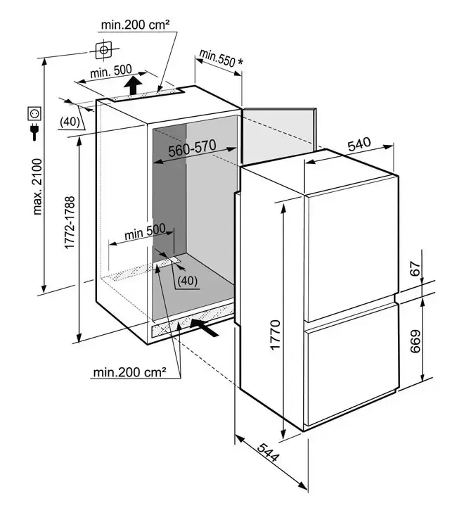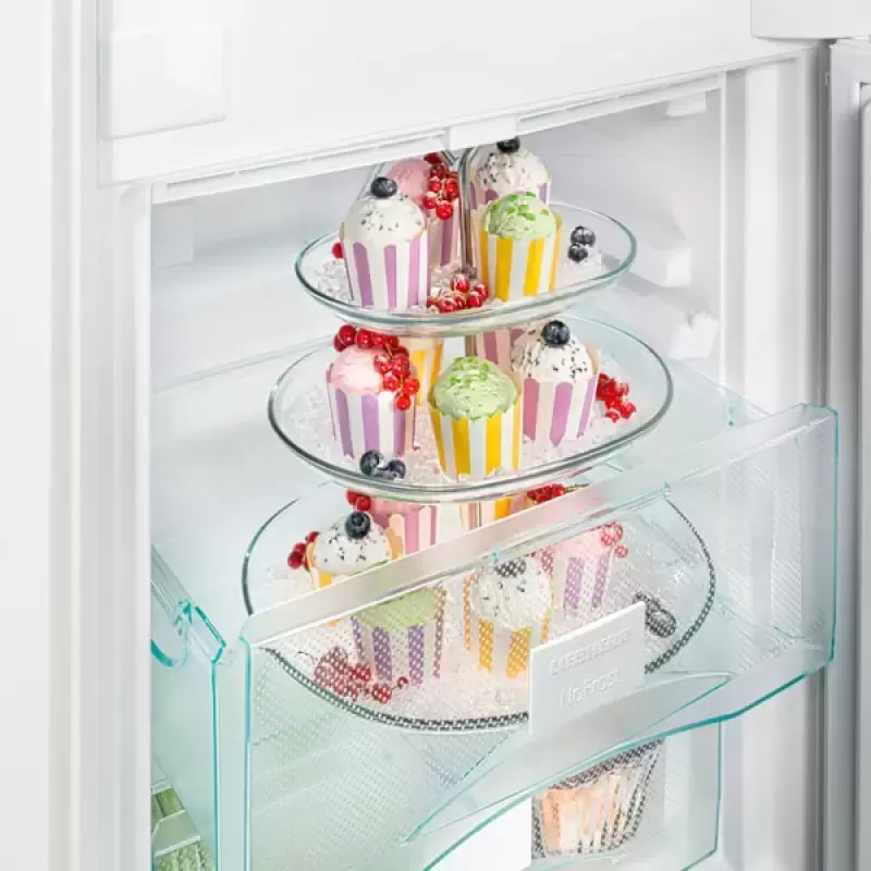 Двухдверная модель высотой 177 см с нижней морозильной камерой может быть установлена в колонну или шкаф в помещении с температурой от +10 до +43°C, что соответствует климатическому классу SN — T. Дверцу при установке можно перенавесить справа налево, а высоту прибора — изменить при помощи регулируемых ножек. На дверцу навешивается мебельный фасад со скользящим креплением по системе door sliding. При повышении наружной температуры предусмотрено включение дополнительной вентиляции, равномерно распределяющий охлажденный воздух по холодильной камере. Полки в камере изготовлены из прочного стекла, устойчивого к механическим воздействиям. Средняя полка может складываться для размещения посуды большого размера. В морозильном отделении находятся три контейнера с плотно закрывающимися крышками, без зазоров прилегающие к стенкам камеры. Эти контейнеры можно вытащить, если продукты в них не помещаются. При одномоментной загрузке новой порции продуктов используется режим SuperFrost, быстро понижающий температуру: продукты замораживаются с полным сохранением вкуса и внешнего вида.