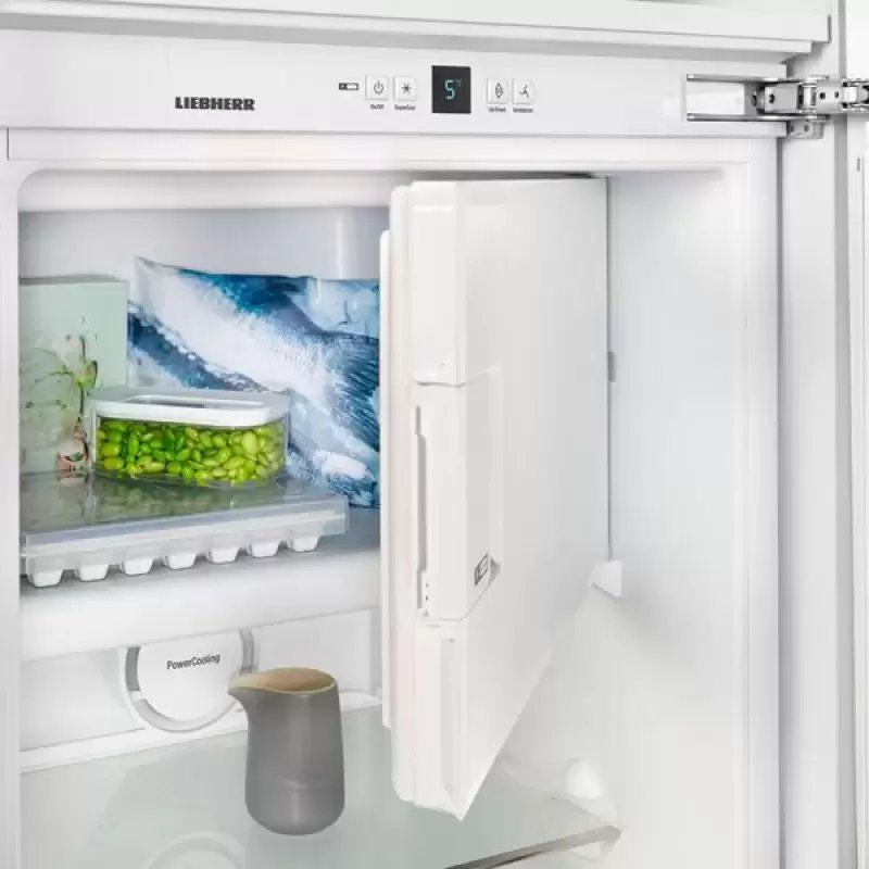 Встраиваемое устройство может устанавливаться в кухонный гарнитур бок о бок с морозильной камерой от того же производителя. Для удобства встраивания предусматриваются регулируемые по высоте ножки и мебельная вентиляция цоколя. Зона свежести BioCool позволяет регулировать влажность для поддержания свежести различных продуктов: при меньшей влажности увеличивается срок хранения свежего мяса, рыбы, молочных продуктов и колбас, а при увеличенной влажности лучше хранятся овощи, фрукты и зелень. Система охлаждения PowerCooling с вентилятором поддерживает одинаковую температуру внутри всей холодильной камеры. Рекомендуется включать вентилятор при наружной температуре свыше 33 °C и высокой влажности. На дверце размещаются полки Comfort GlassLine из стекла с пластиковым обрамлением, оснащенные держателями для бутылок и консервных банок, и раздвижной контейнер для хранения яиц. Верхняя морозильная камера объемом 27 литров имеет производительность замораживания 2 кг продуктов в сутки, в ней находится лоток для получения кубиков льда. Официальная гарантия на изделие предоставляется производителем с момента покупки, срок ее составляет 24 месяца.