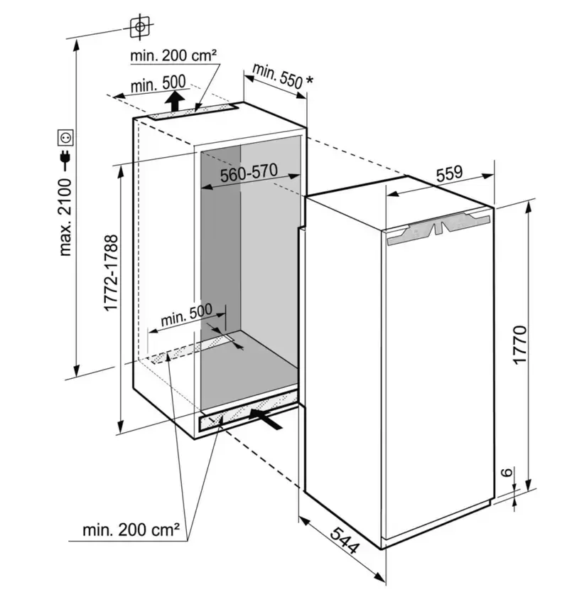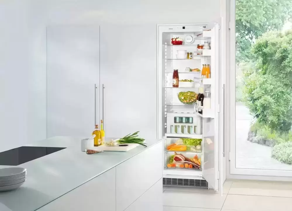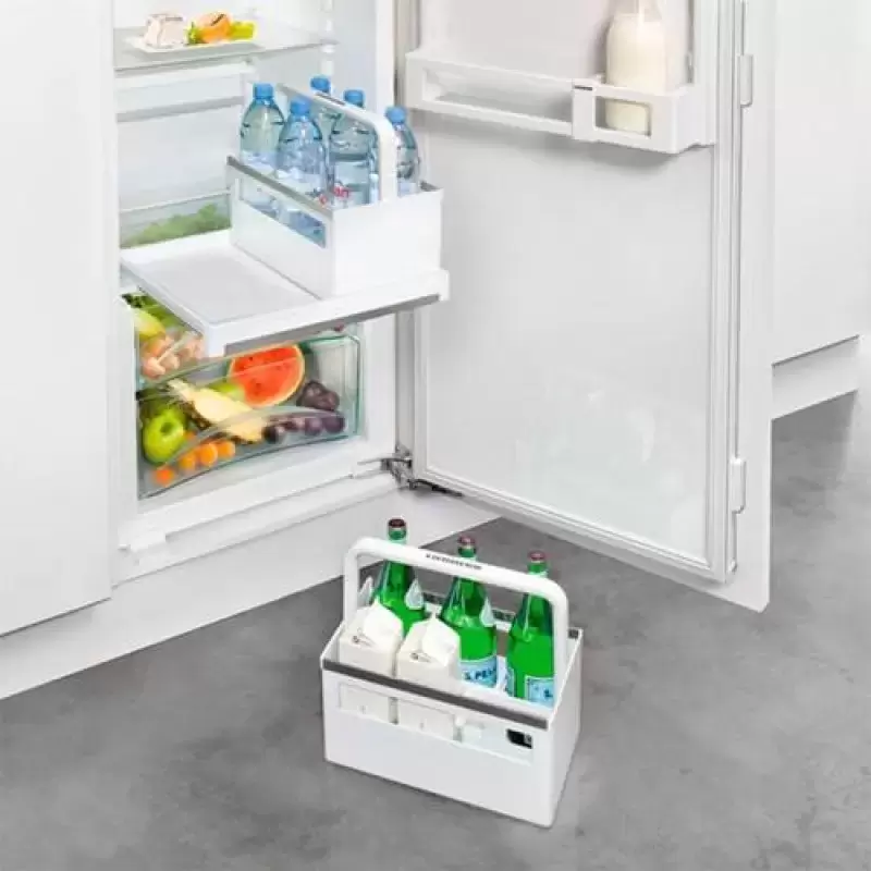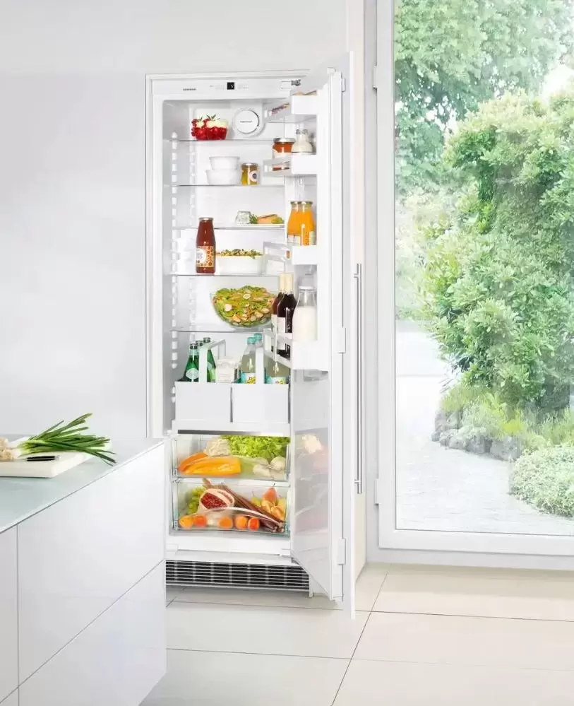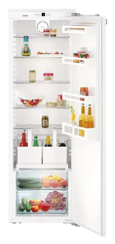 Устройство высотой 177 см с одной дверцей без морозильной камеры имеет правый дверной упор, при необходимости петли можно перенавесить на левую сторону. Регулируемые ножки облегчают встраивание в готовую нишу или колонну. Декоративный мебельный фасад жестко крепится прямо на дверцу: простота конструкции обеспечивает дополнительную прочность, а также позволяет широко открывать дверцу. Автоматическая система размораживания гарантирует легкую очистку стенок, на которых не оседает лед и иней. Светодиодное освещение позволяет быстро отыскать продукты в камере. Полки изготовлены в дизайне Comfort GlassLine из высококачественного закаленного стекла и могут регулироваться по высоте. Для хранения овощей и фруктов предусмотрен большой ящик. Средняя полка может складываться в двух положениях. Режим суперохлаждения SuperСool эффективно понижает температуру в камере перед загрузкой свежих продуктов в большом количестве. Панель управления может блокироваться от детей. Холодильник отличается экономичностью и относится к классу энергоэффективности А++. Комфорт в использовании гарантирует инверторный компрессор с очень низким уровнем шума — 34 дБ.