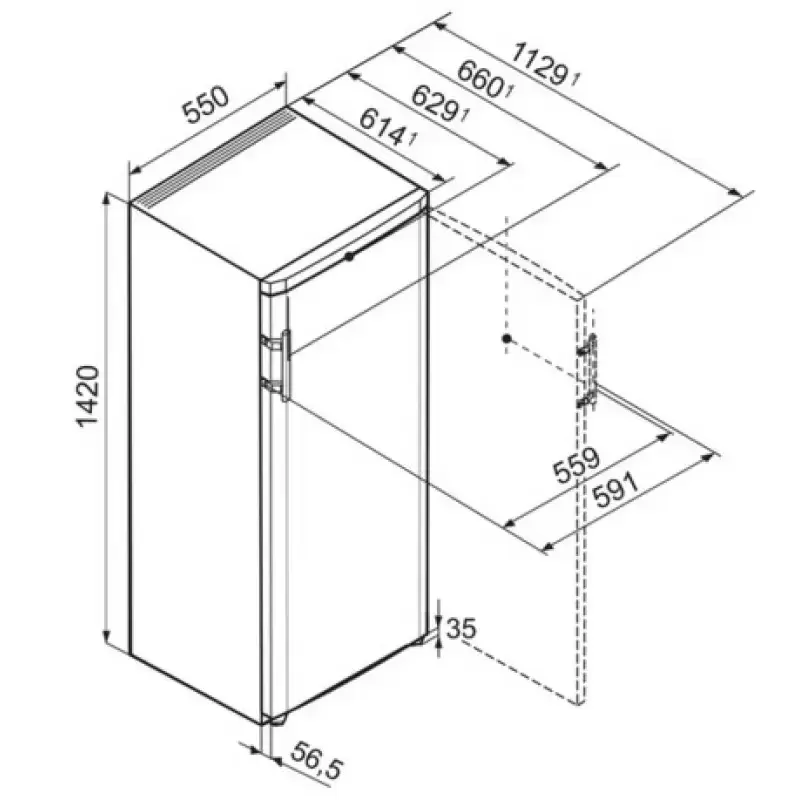 Liebherr K 2814 — отдельно стоящий однокамерный холодильник класса Comfort. Прибор высотой 140 см и полезным объемом 250 л оснащен верхней морозильной камерой полезным объемом 21 л. Класс энергетической эффективности A++ гарантирует низкое потребление электроэнергии — в среднем оно составляет 161 кВтч/год. Модель с глянцевым белым фасадом имеет одну дверцу, которую можно при желании перенавесить справа налево. Ручка для удобства снабжена встроенным толкателем. Система CoolPlus позволяет предохранить устройство от размораживания при температуре окружающей среды менее 18°C. Холодильное отделение с автоматической системой оттаивания оснащено пятью полками из закаленного стекла, при этом четыре из них регулируются по высоте. Полки на дверце выполнены в фирменном дизайне GlassLine. В морозильном отделении мощность замораживания достигает до 2 кг продуктов в сутки, а время сохранения холода при отключении электроэнергии составляет 15 часов. Механическая система управления с поворотным переключателем позволяет выставить один из 7 уровней охлаждения.