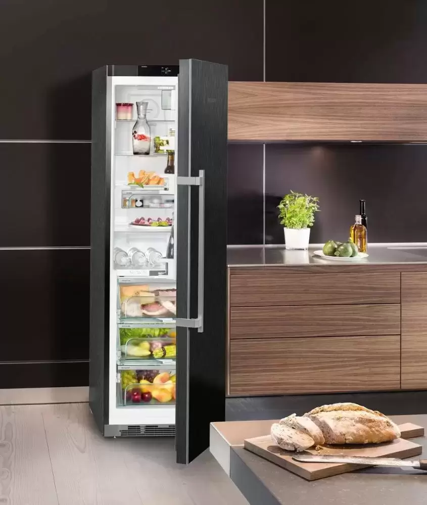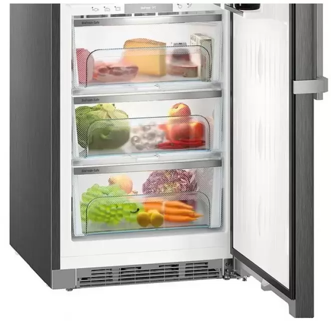 Модель высотой 185 см можно устанавливать в готовую нишу или придвигать вплотную к стене. Корпус оригинального цвета Black Steel выполнен из нержавеющей стали с обработкой от отпечатков пальцев. Дверной доводчик SoftSystem обеспечивает мягкое закрытие дверцы, даже если холодильник полон. Внутреннее наполнение включает 5 регулируемых по высоте полок и одну фиксированную из закаленного стекла, отделения для бутылок и консервов, два контейнера с плотной силиконовой крышкой VarioBox для масла и сыра на дверце. В зоне свежести находятся два отделения, которые выдвигаются на телескопических шинах: Dry Safe и HydroSafe с разным уровнем влажности. Включение режима суперохлаждения SuperСool поможет подготовить камеру к загрузке большой партии продуктов. Светодиодное освещение с эффектом плавного изменения яркости создает отличный обзор. Дополнительно можно установить модуль дистанционного управления SmartDeviceBox, чтобы задавать настройки с мобильных устройств. О неисправностях, повышении температуры и неплотно закрытой дверце предупреждает оптическая и звуковая сигнализация. Энергопотребление модели соответствует высокому классу А++.