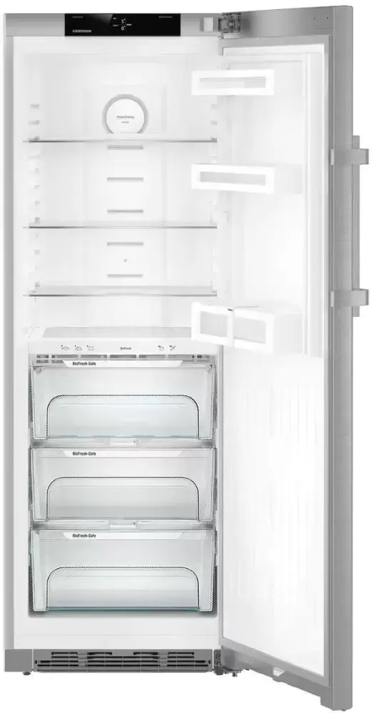 Холодильная камера с циркуляционным охлаждением PowerCooling эффективно сохраняет продукты как можно дольше без образования инея или заветренной корочки. Почти половина внутреннего пространства отведена под зону свежести BioFresh. В ней три контейнера на телескопических направляющих, что облегчает загрузку продуктов и повышает безопасность использования. Два отделения HydroSafe позволяют сохранить свежесть овощей и фруктов при температуре около нуля и высокой влажности. Один контейнер DrySafe идеально подходит для хранения мяса, рыбы, молочных продуктов, так как в нем при той же нулевой температуре влажности намного ниже.