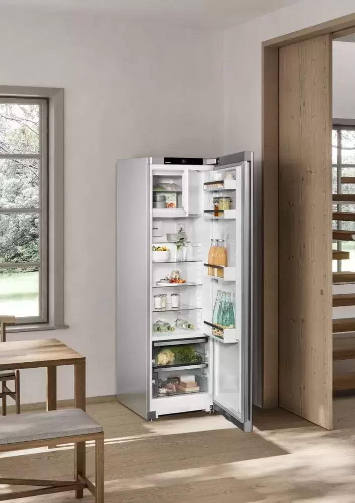 Liebherr RBsfe 5221 — высокий серебристый отдельно стоящий холодильник с одной дверцей, внутри имеется небольшое морозильное отделение и зона свежести BioFresh. Для управления используется большой сенсорный экран в верхней части корпуса. Для легкой очистки предусмотрено автоматическое размораживание. Дверцу при необходимости можно перенавесить.