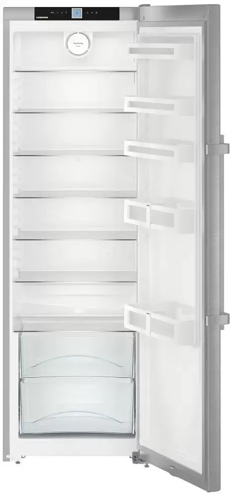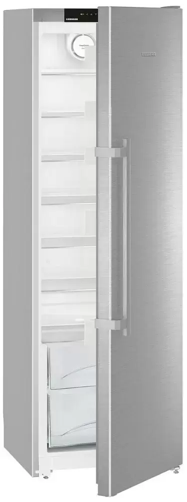 Преимущество данной модели — продуманное электронное управление настройками и система оповещений о неисправностях. За дверью на верхней перекладине камеры расположены кнопки переключения и LED-дисплей. Вы можете установить необходимую температуру, активировать дополнительные опции — например, суперохлаждение или блокировку от детей. В случае сбоя в работе или при долго открытой двери холодильник подаст сигнал.