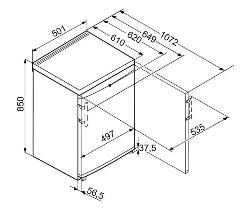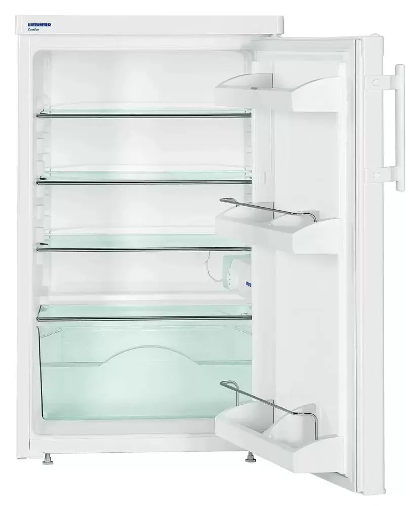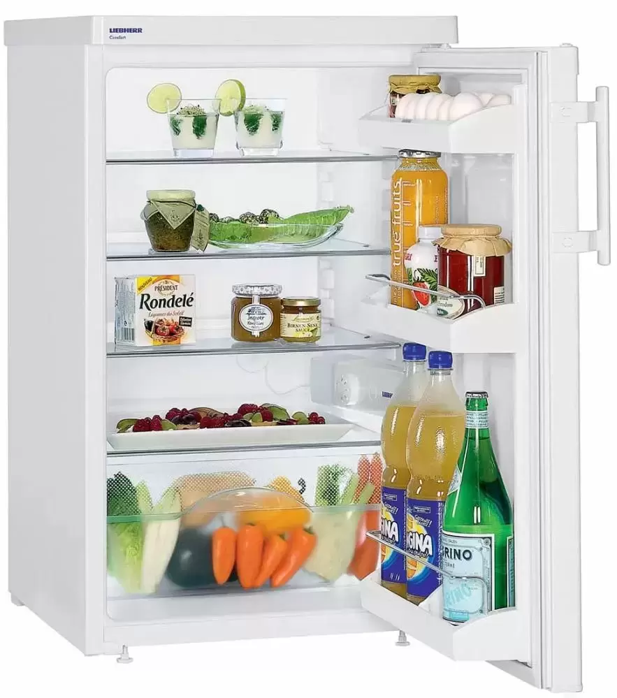 Холодильник Liebherr T 1410 Comfort — отдельно стоящая компактная модель универсального белого цвета высотой 85 см и шириной 50 см для размещения под столешницей. Устройство оснащено мебельной системой вентиляции и может устанавливаться вплотную к стене, а также встраиваться в готовую тумбу или нишу. Общий объем 141 литр позволяет разместить в камере достаточно большое количество продуктов. Внутреннее наполнение представлено четырьмя полками из высокопрочного стекла, часть из которых можно регулировать по высоте. Больше удобства при размещении предоставляют полки для бутылок и банок на дверце, а также прозрачный контейнер для овощей и фруктов. Полки дополнены пластиковой рамкой, так что случайно пролитая жидкость не повредит кухонную мебель. Регулировка температуры производится с помощью хорошо знакомого поворотного переключателя. Капельная система размораживания гарантирует легкую очистку камеры и отсутствие наледи на стенках и продуктах. Климатический класс SN-ST позволяет использовать устройство при наружных температурах от +10 до + 38 градусов.