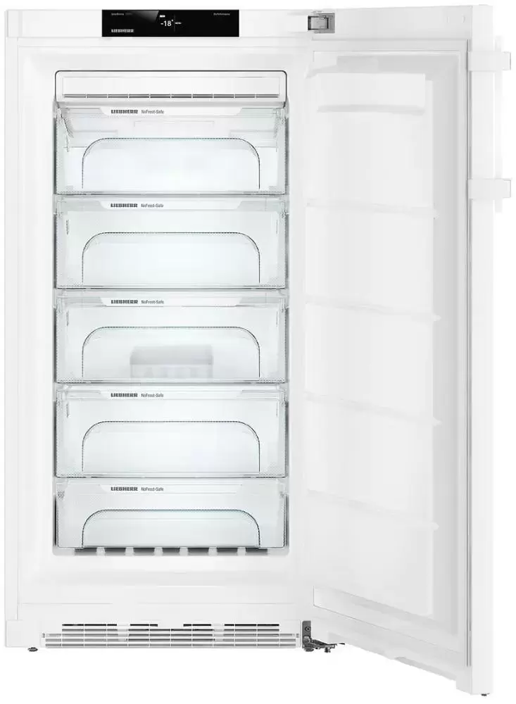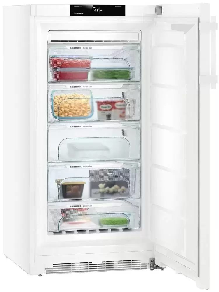 Отдельностоящая морозильная камера с перенавешиваемой дверью впишется в любую кухню. Вы можете установить прибор вплотную к стене или в готовую нишу. Система NoFrost обеспечивает равномерное распределение холодного воздуха, предотвращает скопление влаги и превращение ее в иней. 5 контейнеров из закаленного стекла удобно выдвигаются, поэтому вы легко достанете продукты даже из переполненного отделения.
