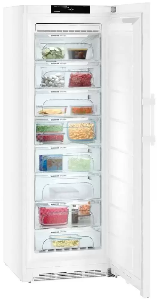 Система охлаждения NoFrost обеспечивает долгое хранение без образования инея: воздух постоянно циркулирует по камере, отводится влага. Статус BluPerfomance гарантирует эффективную, экономичную и тихую работу техники. Электронная закрытая панель управления с сенсорным дисплеем поможет выставить температуру от −14°C до −28°C. Синий индикатор статуса оповещает о нормальном состоянии прибора, даже если дверь закрыта. 8 плотно закрывающихся ящиков FrostSafe из закаленного стекла составляют внутреннее наполнение. Функция суперзамораживания поддерживает низкую температуру при одновременной загрузке большого объема продуктов.