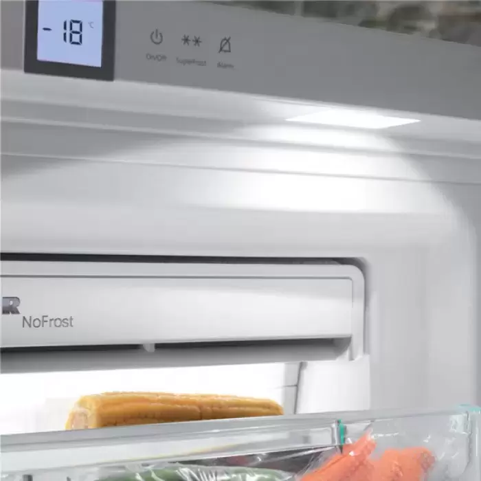 Модель оснащена системой размораживания NoFrost: уход за ней не составит труда, так как на стенках не образуется иней. Для быстрого понижения температуры до −32°С предусмотрен автоматический режим SuperFrost: его можно использовать перед закладкой в камеру большого количества продуктов. Внутреннее наполнение составляют стеклянные полки Premium GlassLine и полностью закрытые выдвижные контейнеры FrostSafe с прозрачной передней панелью, а также контейнер для трав и ягод. Полки и контейнеры можно убрать, если планируется размещение крупных продуктов.