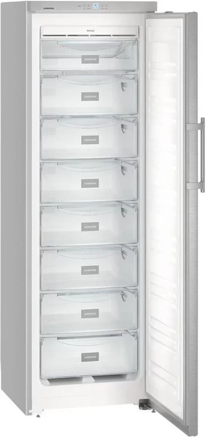 Морозильник Liebherr GNPef 3013 Comfort NoFrost в серебристом корпусе из окрашенной стали оснащен системой размораживания No Frost и способен заморозить до 20 кг/сутки. Прибор можно устанавливать вплотную к стене. Для хранения продуктов служат 8 контейнеров FrostSafe с прозрачным фронтом.