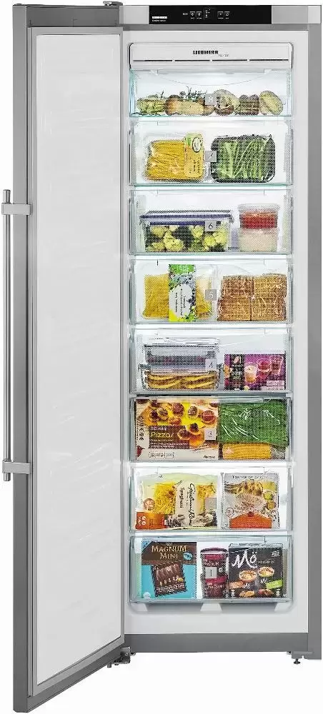 Отдельно стоящее устройство высотой 185,2 см и шириной 60 см может устанавливать вплотную к стене для экономии места на кухне. Дверная ручка оснащена встроенным толкателем. Корпус серебристого цвета изготовлен из стали, а фронт устройства — из нержавеющей стали с покрытием SmartSteel для защиты от отпечатков пальцев. Выдвижные контейнеры FrostSafe с прозрачной передней частью изготовлены их экологически безопасного пластика с покрытием, не допускающим примерзания продуктов к стенкам. Плотно закрывающиеся крышки позволяют эффективно удерживать холод. Система размораживания NoFrost гарантирует бережное хранение продуктов без заветривания, исключает образование инея и льда, а также облегчает уход за прибором. Оптическая и акустическая сигнализация предупреждает о возникновении неисправностей, а также о неплотно закрытой дверце. Режим суперзамораживания SuperFrost с автоматическим отключением через 65 часов помогает быстро заморозить большое количество вновь загруженных продуктов при температуре от −32 до −38 °С с полным сохранением всех полезных веществ, вкуса и внешнего вида. При отключении электроэнергии холод сохраняется в течение 24 часов.