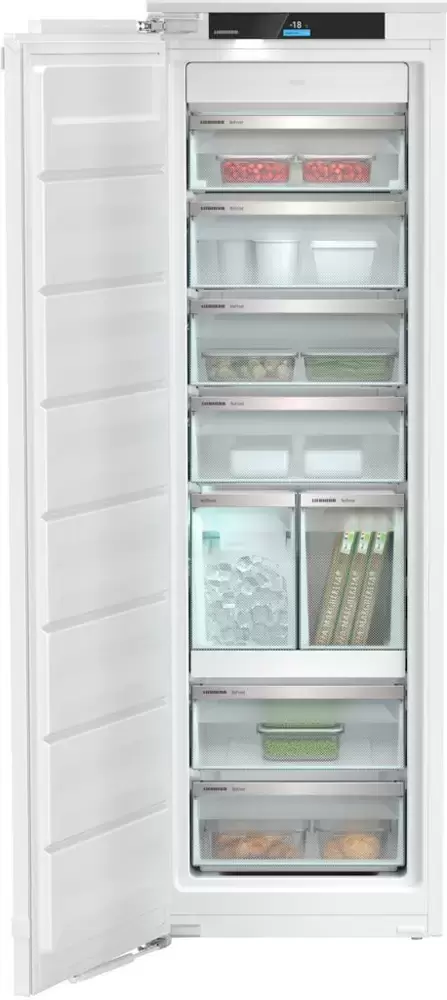 Морозильная камера встраивается в нишу рядом с холодильной из той же серии, либо отдельно. Ее можно использовать как дополнительное место для хранения — например, на даче, если у вас большое количество заготовок (ягод, овощей, мяса или рыбы). В данной модели большой отсек для льда, который вырабатывается за счет встроенного ледогенератора. Его можно также использовать для охлаждения свежих продуктов или добавлять в напитки в летнюю жару.