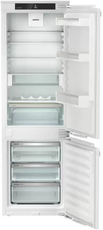 Холодильник Liebherr ICNe 5123 Plus NoFrost — встраиваемая модель. Для его установки необходима специальная ниша в мебельном гарнитуре. Устройство остается невидимым в интерьере, так как на его фасад навешивается декоративная панель. Прибор представляет собой традиционную комбинация — морозильное отделение снизу и холодильное сверху. Эргономичность внутреннего пространства обеспечивает удобное расположение продуктов и упаковок. Для этого предусмотрены ящики, полки, держатель для бутылок, а также балконы на двери. Электронное управление обеспечивает точность при внесении настроек. Холодильник Либхер ICNe 5123 не требует размораживания, что облегчает процесс обслуживания, экономит время и силы. Тихая работа — еще одно преимущество изделия. Уровень шума составляет всего 36 дБ, что является комфортным значением.