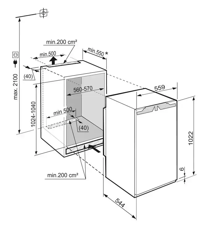 Небольшое устройство высотой 102 см и емкостью 192 литра с автоматической системой размораживания полностью интегрируется в интерьер и подойдет для установки дома, в офисе или в гостинице. Дверные петли находятся справа, но без труда перенавешиваются на левую сторону. Дверца открывается очень широко благодаря жесткой навеске мебельного фасада. Прибор оснащен электронным управлением: панель управления располагается в верхней части за дверцей и включает сенсорные кнопки и ЖК-дисплей MagicEye с цифровой индикацией температуры. Функции панели управления можно заблокировать от детей. Специальный индикатор и звуковой сигнал оповестит о неплотно закрытой дверце. Модель отличает уникально низкий уровень шума, равный всего 33 дБ. При повышении наружной температуры рекомендуется включать встроенный вентилятор, равномерно распределяющих охлажденный воздух по всему объему камеры. Режим суперохлаждения SuperСool позволит уменьшить температуру перед тем, как загрузить в холодильник большое количество продуктов. Полки Premium GlassLine изготовлены из ударопрочного стекла, их можно регулировать по высоте, а среднюю полку — складывать в двух положениях.