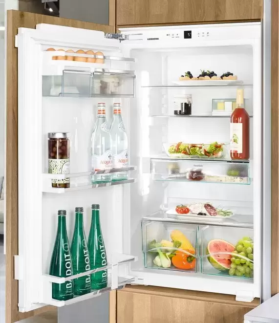 Встраиваемый холодильник Liebherr с отделением BioCool. Дверца модели закрывается плавно — доводчик обеспечивает удивительно мягкое закрывание двери даже при максимальном заполнении двери холодильника, если угол открытия составляет менее 30°, холодильная камера закроется автоматически.