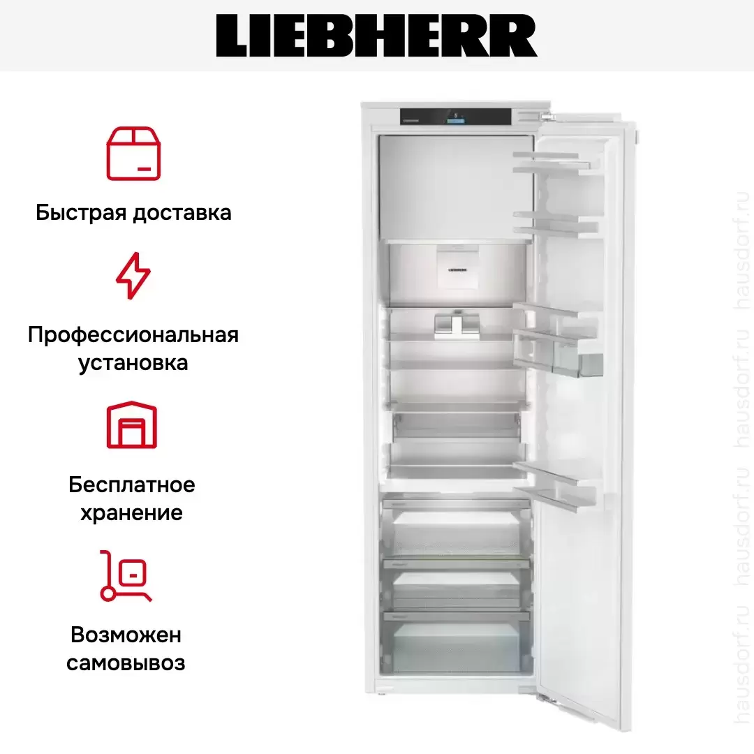 Встраиваемый холодильник Liebherr IRBd 5151 Prime общим объемом в 302 л оснащен верхней морозильной камерой. В него с легкостью поместится посуда большого объема и даже противень. Электронное управление дает возможность выбрать любой режим одним касанием или отследить температуру внутри.