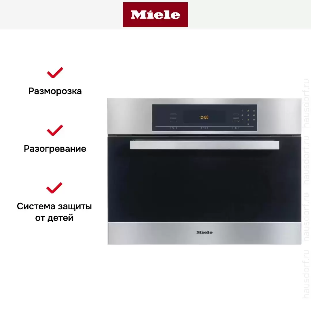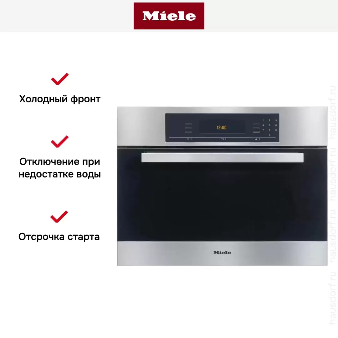 Компактная модель объемом 34 литра изготовлена из нержавеющей стали. Удобная панель управления оснащена сенсорными кнопками и большим дисплеем, а также таймером с отключением. При открытии дверцы подача пара прекращается, а холодный фронт позволяет безопасно вынимать противни из камеры.