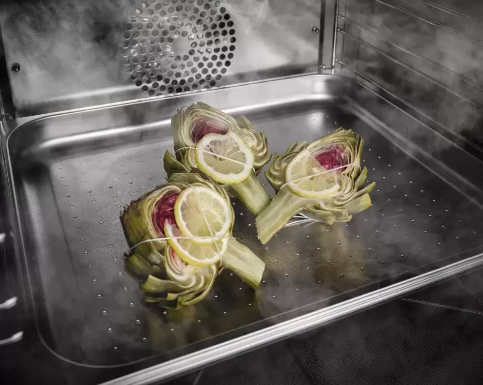 Пароварка Миле имеет функцию автоприготовления. Всего для разных блюд предусмотрено 25 режимов. С помощью отдельной функции вы разогреете еду из холодильника — не нужно подбирать температуру и время, так как за вас уже создали идеальную комбинацию. Замороженные полуфабрикаты и заготовки быстро и без потери питательных веществ и структуры будут готовы к дальнейшей готовке. Из программ, характерных для духовки, сюда включены: нагрев с помощью верхнего тэна, нижний нагрев, комбинированный жар сверху и снизу одновременно, приготовление с помощью гриля. Другие функциональные преимущества этой модели: внешний парогенератор, приготовление пищи в вакуумной упаковке Sous-vide, комби-пар для выпекания и поджаривания блюд с добавлением пара, редукция пара, быстрый разогрев, предварительный разогрев, Touch2Open / Моторизованная лифтовая панель управления.