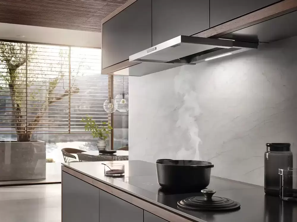 Встраиваемая вытяжка — выбор тех, кто хочет максимально задекорировать технику, или владельцев маленькой кухни. Тип встраивания: в шкаф. Обратите внимание на цветовые сочетания модели Miele DAS 2620, чтобы органично вписать ее в свою квартиру. Оттенок корпуса: нержавеющая сталь. Благодаря лампочкам, которые расположены на нем, можно освещать плиту и столешницу рядом, чтобы готовить было еще проще и приятнее. Фишка этой техники — выдвижная панель.