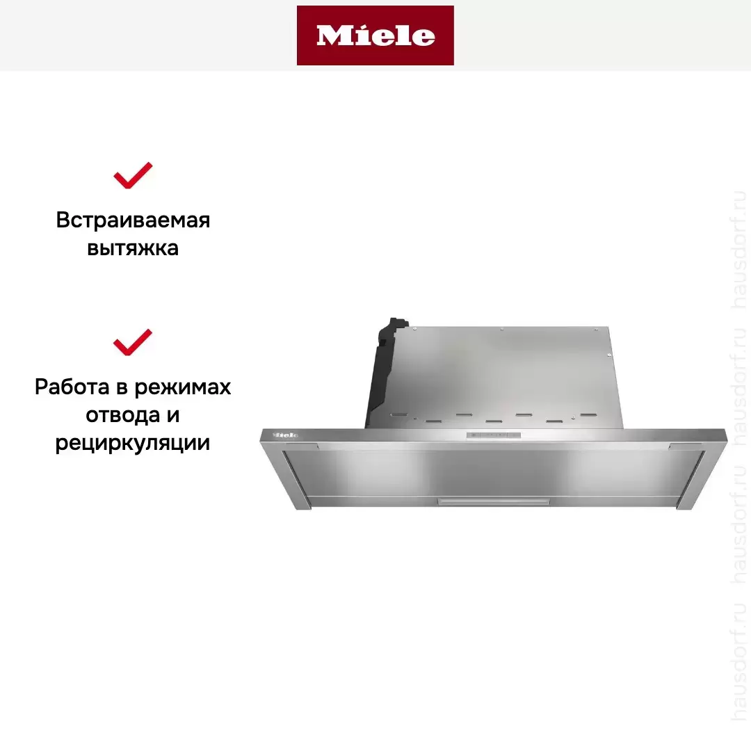 Вытяжка Miele DAS 2920 — встраиваемая модель от известного производителя. Она интегрируется в навесной шкаф. Корпус скрывается за мебельным фасадом — видимым остается только основание, куда поступает воздух, поэтому устройство будет актуально для любых интерьерных решений. Прибор выполнен из качественной нержавеющей стали, которая отличается легкостью в уходе и устойчивостью к образованию коррозии. Модель может работать в режиме отвода и рециркуляции. Первый вариант предусматривает вывод потоков по вентиляционному каналу, а второй — очистку при помощи угольного фильтра. Для пользователя доступно три режима скорости, поэтому можно подобрать оптимальный вариант, исходя из текущих условий. Для быстрого устранения нежелательных запахов можно активировать интенсивный режим.