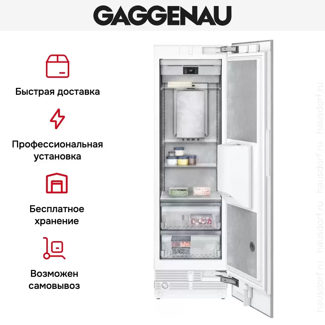 Морозильник Gaggenau встраивается в мебель, открывается с помощью ручки или автоматически. На двери расположен ледогенератор с постоянной подачей воды, режимы работы: лед, крошка и охлажденная вода. В камере установлены полки из закаленного стекла, две из них можно переставить по высоте. Цвет — нержавеющая сталь и темный антрацит.