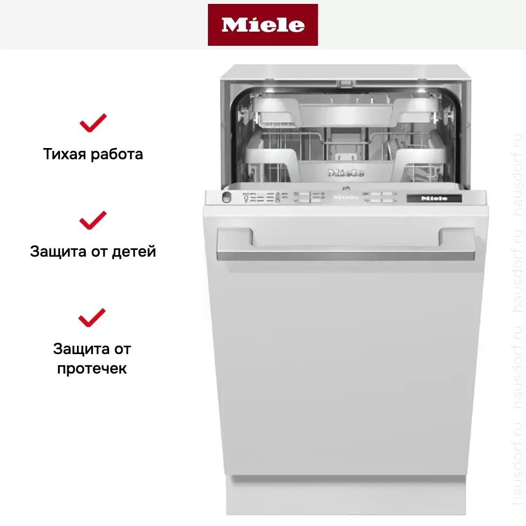 Полновстраиваемая посудомоечная машина Miele G 5890 SCVi SL может быть установлена в небольшой кухне благодаря ширине всего 45 см. Модель рассчитана на одновременное мытье до 9 комплектов посуды. Автоматические программы включают интенсивную программу мойки при 75°C, короткую, экспресс, деликатную, программу с усиленной сушкой, уход за техникой. Имеется программа для обработки детской посуды. Предусмотрена возможность удаленного управления работой прибора через приложение MobileControl.