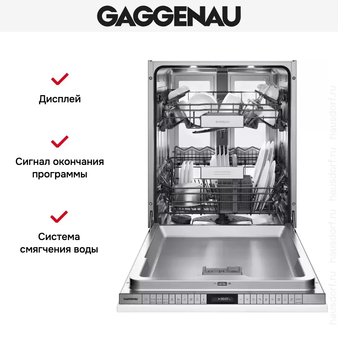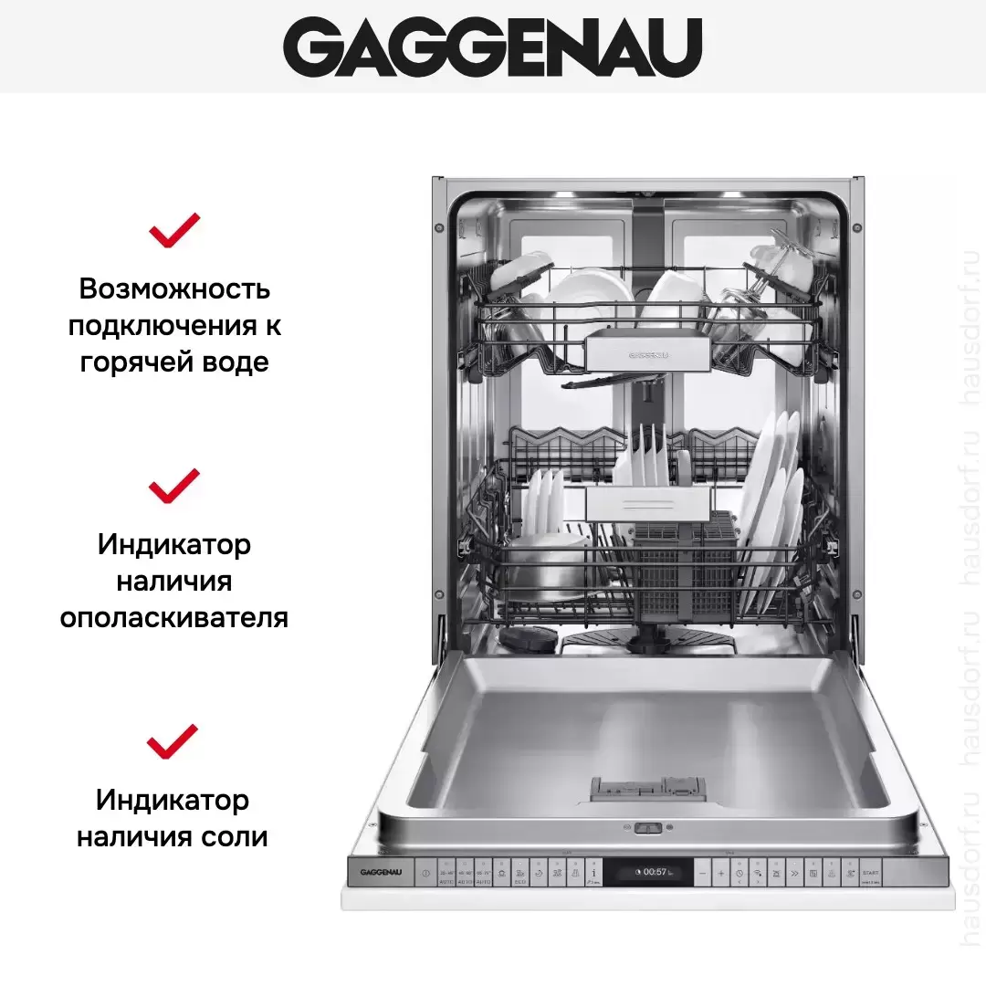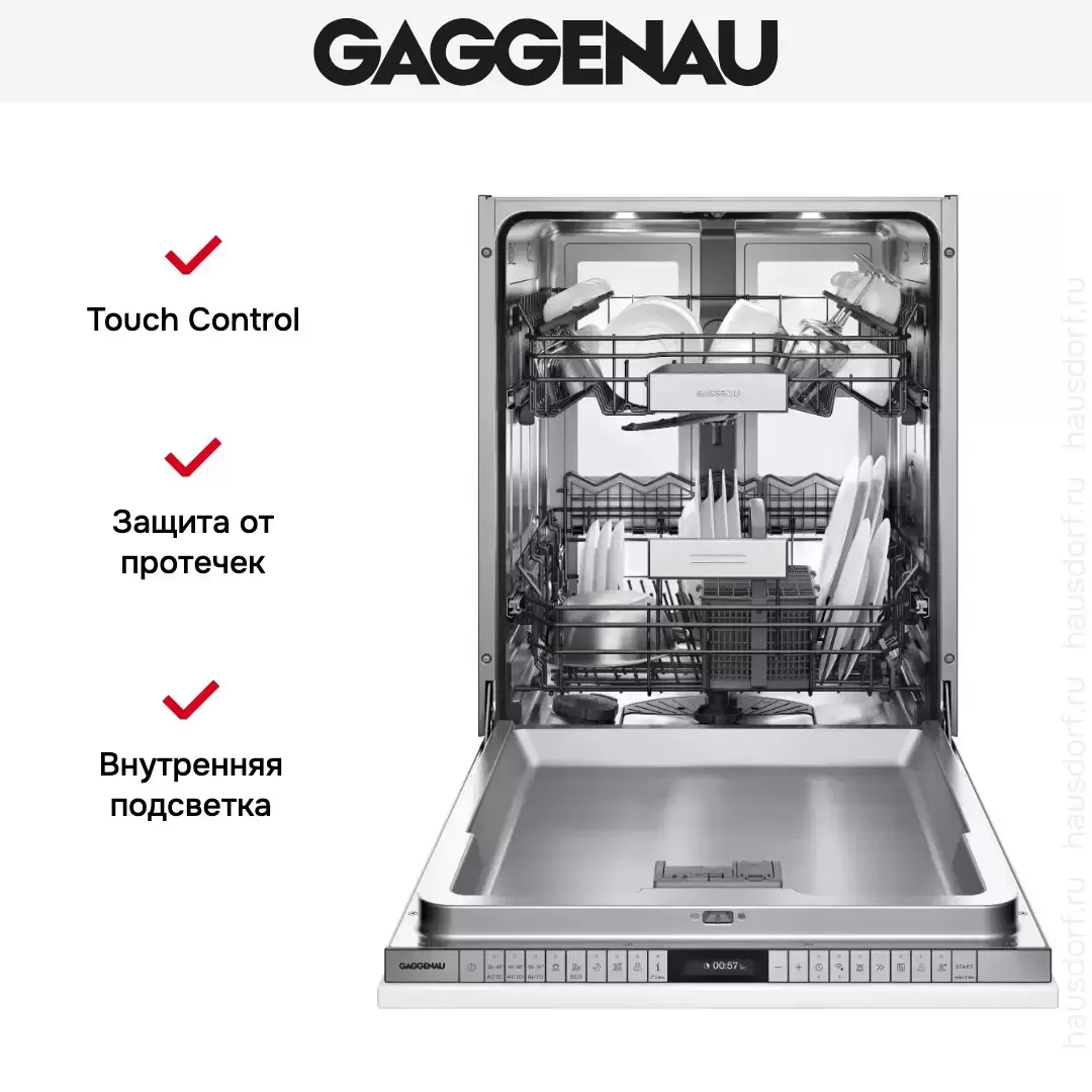 Посудомоечная машина полностью встраивается в нишу. В камеру можно загрузить посуду для приготовления пищи и сервировки, стекло, обычные стаканы и винные бокалы. Все предметы оптимально размещаются в верхнем и нижнем коробе благодаря регулируемым по высоте корзинам и складным полкам. Для высоких бокалов есть специальный держатель.
