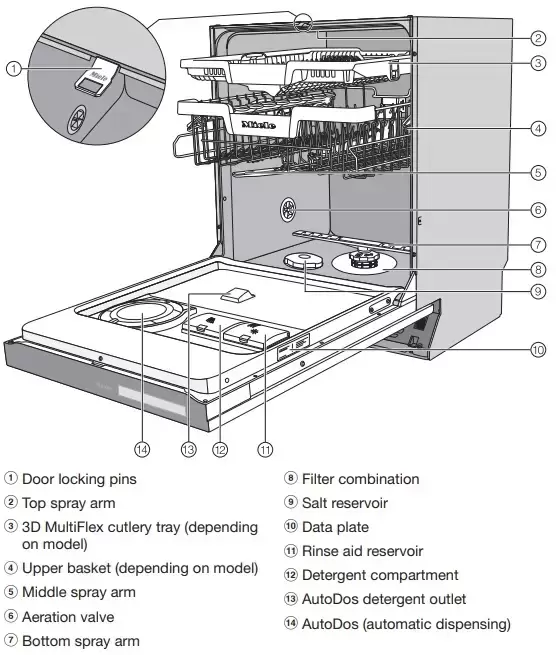 Встраиваемая модель Миле отлично впишется в любой интерьер, главное — правильно выбрать место, чтобы подвести коммуникации. Устанавливается в нишу целиком, полностью закрывается декоративной панелью. Обратите внимание: в комплекте не идет фасад, его необходимо установить самостоятельно. Имеет стандартные размеры, поэтому может не поместиться на очень маленькой кухне. В камеру можно загрузить ограниченное число комплектов: 14 шт. Комплектом считается набор посуды на одного человека, который нужен для полноценного приема пищи: глубокая и плоская тарелки, тарелка для салата, блюдце под чашку, сама чашка, ложка и вилка.