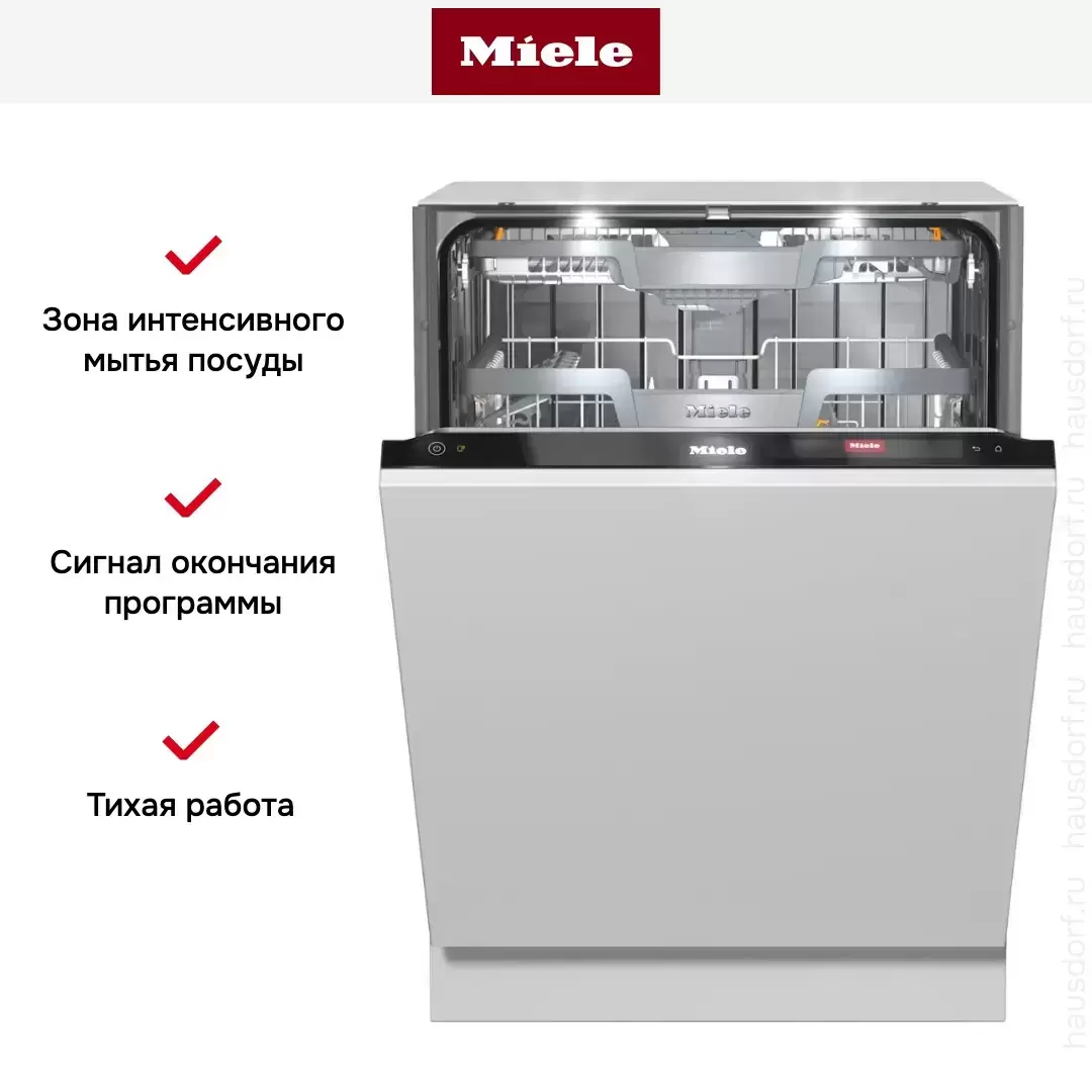 Встраиваемая модель Миле отлично впишется в любой интерьер, главное — правильно выбрать место, чтобы подвести коммуникации. Устанавливается в нишу целиком, полностью закрывается декоративной панелью. Обратите внимание: в комплекте не идет фасад, его необходимо установить самостоятельно. Имеет стандартные размеры, поэтому может не поместиться на очень маленькой кухне. В камеру можно загрузить ограниченное число комплектов: 14 шт. Комплектом считается набор посуды на одного человека, который нужен для полноценного приема пищи: глубокая и плоская тарелки, тарелка для салата, блюдце под чашку, сама чашка, ложка и вилка.