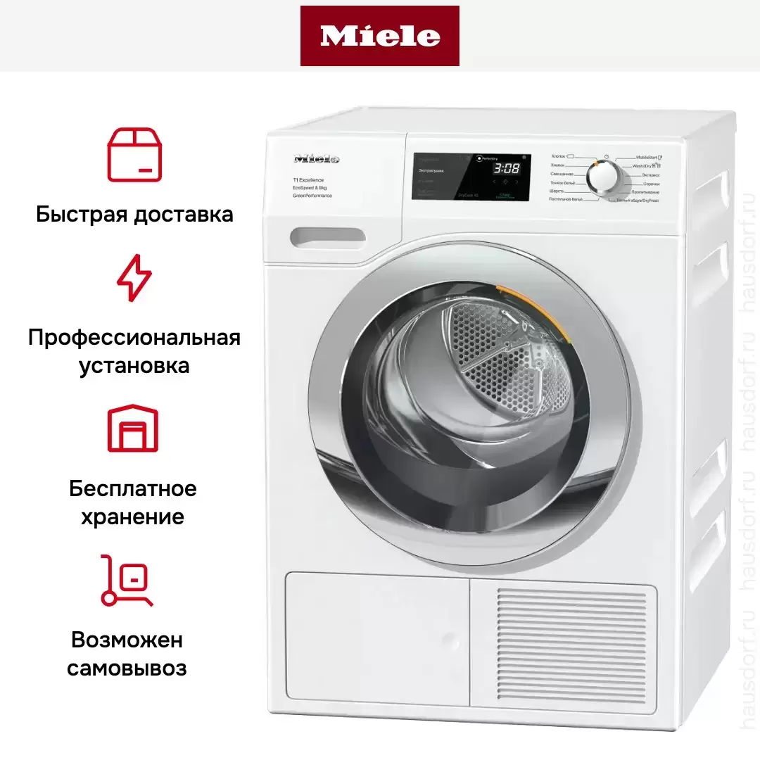 Сушильная машина Миле TEF775WP оборудована разнообразными функциями, среди который отсрочка старта. Таймер можно задать до 24 включительно и выбрать необходимое время для начала цикла. Повышает удобство эксплуатации наличие внутреннего освещения в барабане. Бесщеточный мотор обеспечивает тихую работу. В комплектацию, помимо подробной инструкции по эксплуатации, входит флакон с ароматизатором, который придает белье неповторимый аромат. Устройство можно установить под столешницу, в формате side-by-side или в колонну, что значительно расширяет возможности для интеграции. Среди преимуществ изделия — не требующий обслуживания теплообменник.