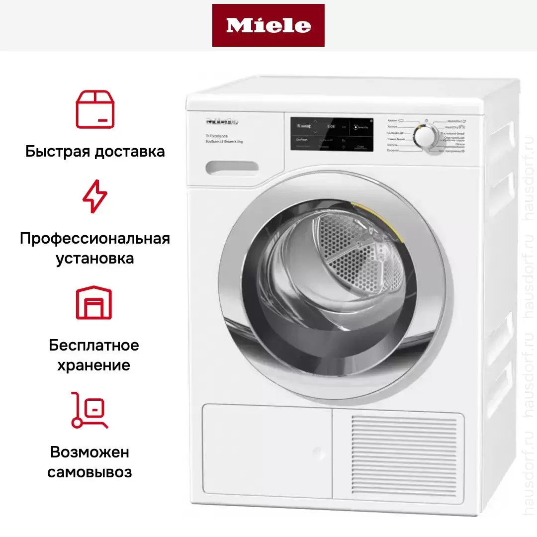 Miele TEL 785 WP — сушильная машина с весом загрузки до 9 кг белья, которая может быть установлена под столешницей, на стиральную машину или бок о бок с ней. При установке в колонну необходимо приобрести крепежный комплект дополнительно. Сушка производится за счет компрессора Heat Pump, который не требует специального обслуживания. Конденсат, который образуется в процессе работы, сливается в отдельный резервуар. Благодаря мощному и эффективному бесщеточному двигателю модели присвоен высокий класс энергопотребления А+++. Сотовый барабан SilenceDrum изготовлен из нержавеющей стали.