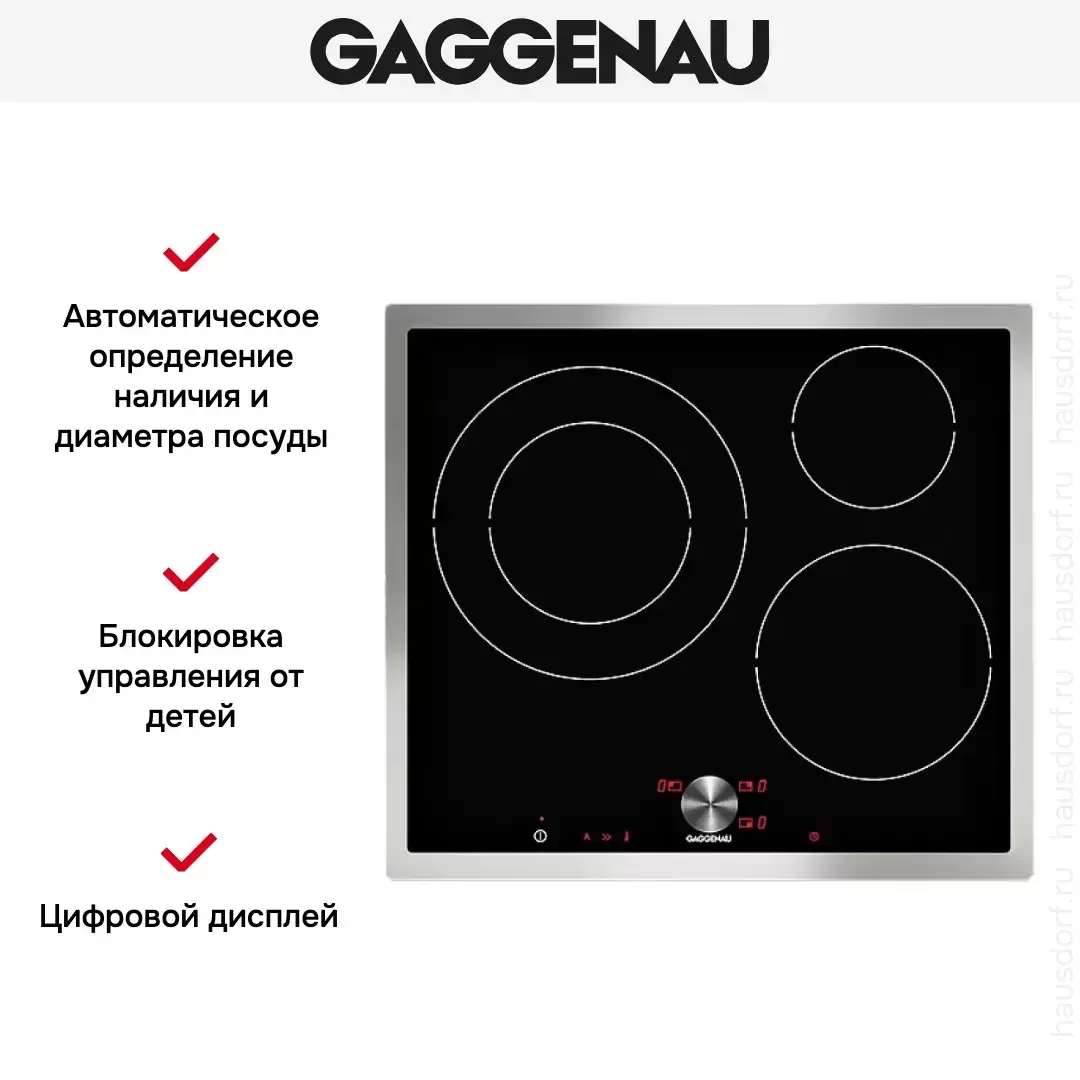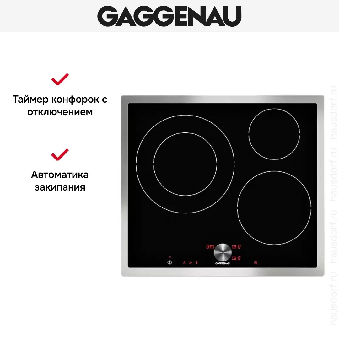 Особенность электрической варочной поверхности Gaggenau CI 262-112 – это его внешний вид: блестящее, особо прочное и не нагревающееся стеклокерамическое покрытие черного цвета в серебристой рамке. Оно дополнено нестандартным расположением трех индукционных конфорок, одна из которых двухрядная, обеспечивающая максимально оперативное приготовление и подогрев. Безопасную эксплуатацию обеспечивает таймер конфорок и кнопка блокировки плиты.