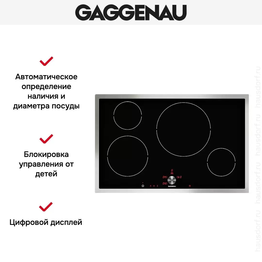 Отличием электрической варочной поверхности Gaggenau CI 481-112 является блестящее стеклокерамическое покрытие стильного черного цвета в серебристой окантовке, нестандартное расположение четырех индукционных конфорок, удобство сенсорно/поворотного управления, удобное меню и память. Высокую безопасность приготовление еды обеспечивает защитное отключение, таймер отключения конфорок, кнопка блокировки всей плиты.