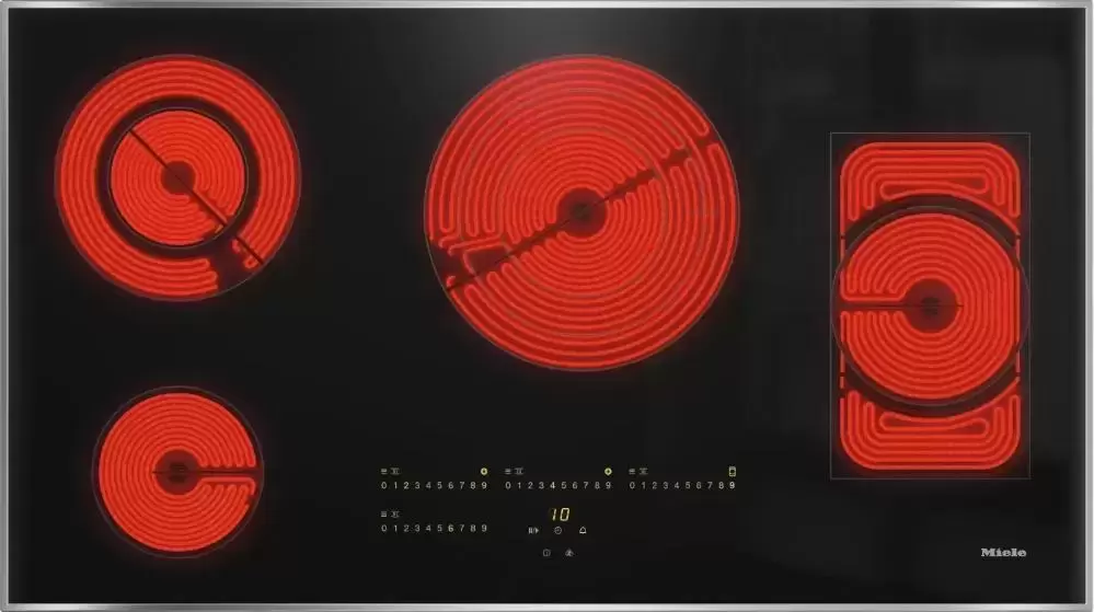 Варочная панель Miele с необычным расположением зон нагрева. Предусмотрена конфорка с прямоугольной зоной расширения для нестандартной посуды или утятницы.